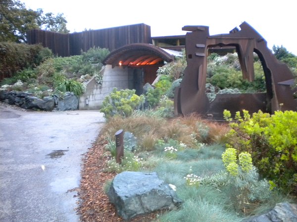 Grimes, it turns out, is one of six treehouses, and I think the best of the lot, for if you go to the Post Ranch Website, and click on “treehouses” it is pictures of Grimes which appear. The other types of accommodations include Coast Houses which are sculptured to resemble a redwood tree, everything angled and woodsy, and Ocean Houses – probably the most coveted of the lot, bermed into the edge of the cliff with grass and flowers growing on the sloping roof, accessed down a little side hobbit-hole path, and opening in full glory to a deck hanging over the Pacific Ocean. The architect Mickey Muenig conceived this masterpiece, fitting it into the old Post Ranch as if it had sprung from nature spirits. I really admire his work.