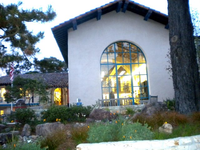We love libraries. Robert is a volunteer at our own Atascadero Library because one of the ladies happened to mention one day – something like -“Oh my! You’re tall! We could use you with the shelving.” And just like that he considered it his own special “service activity”. Whenever we have traveled, we have tended to check out the local library, as if it is some kind of a guideline to the community. In London, Robert was terribly disappointed that not everyone could just walk into the famous Reading Room at the British Museum (although I’ve heard that restriction has been modified since), so we spent the time looking at the mummies instead. And if we had gained entry to the Reading Room to see if it had or had not “lost it’s charm”, it might very well have rated as our favorite. But having missed that opportunity on our one trip to London, we have our own #1 and it is definitely the Harrison Memorial Library on Ocean Ave. in Carmel California, designed by another favorite – the architect Bernard Maybeck, who also designed the Palace of Fine Arts in San Francisco. How good is that! It was our first stop as we strolled Carmel the other evening, and it looked just as inviting as ever, with its cushy chairs by the big window and cozy, narrow aisles, and large crackling fire.