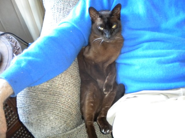 He has always considered me his litter mate I think, and found it great fun to run and leap on me with all four legs and then bound away. Especially fun when he could hit my head as I sleep or my side as I’m reading or otherwise engaged. Sometimes I would have to give him a time out and put him in the bathroom to make him stop. Once when he was young I wadded up a small piece of paper and threw it across the room, hoping to engage him in batting it about. But no. He picked it up in his mouth and brought it back and dropped it at my feet to throw again! And thus was born our many games of “fetch”. Well, one breeder did say that Burmese were the dogs of the cat world.