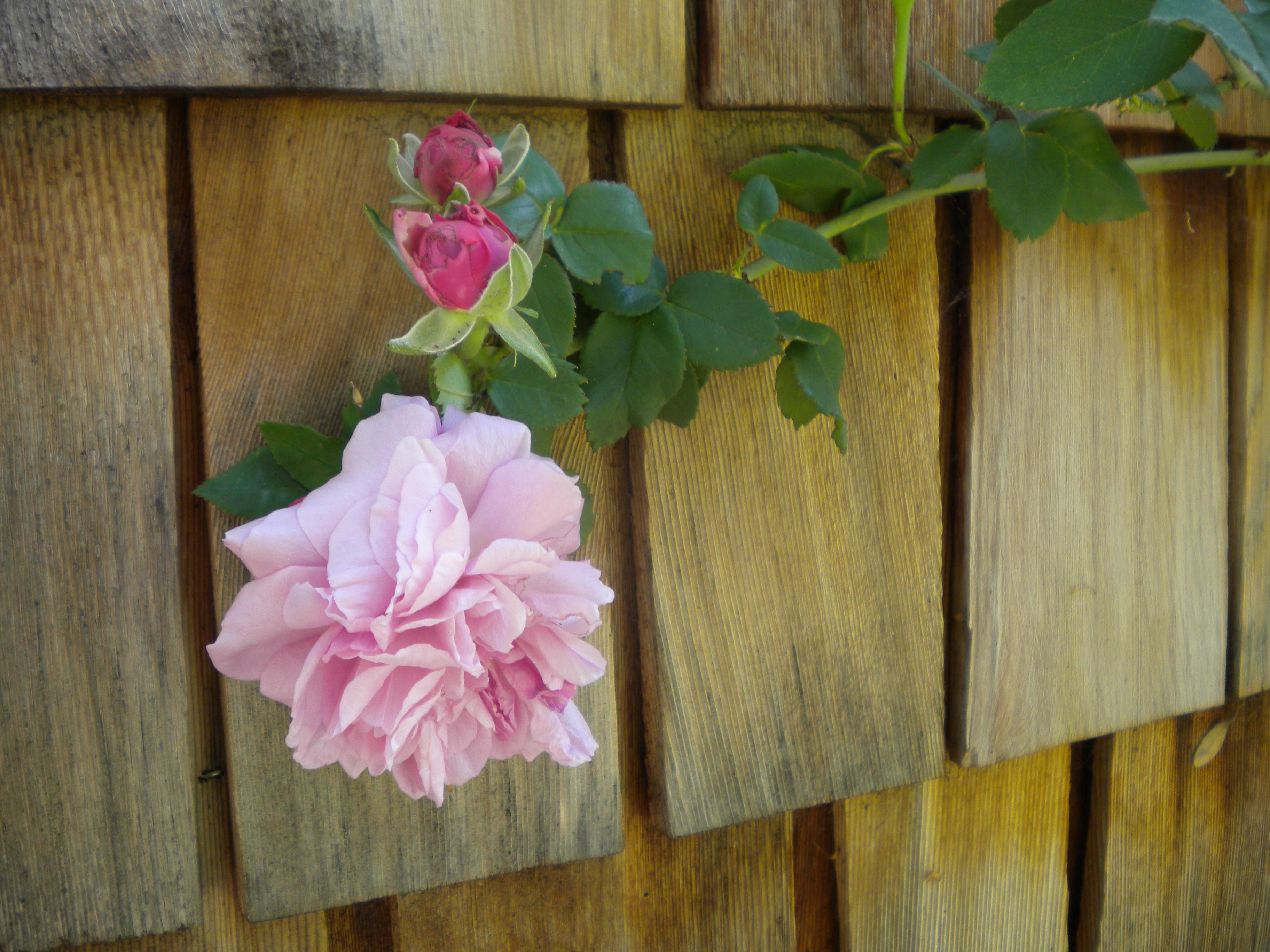 The Bourbon rose, Louise Odier grows flowers all along her arching canes and because she keeps flinging them over the fence, the deer come into some munching. But she’s a real trooper and keeps going into autumn.