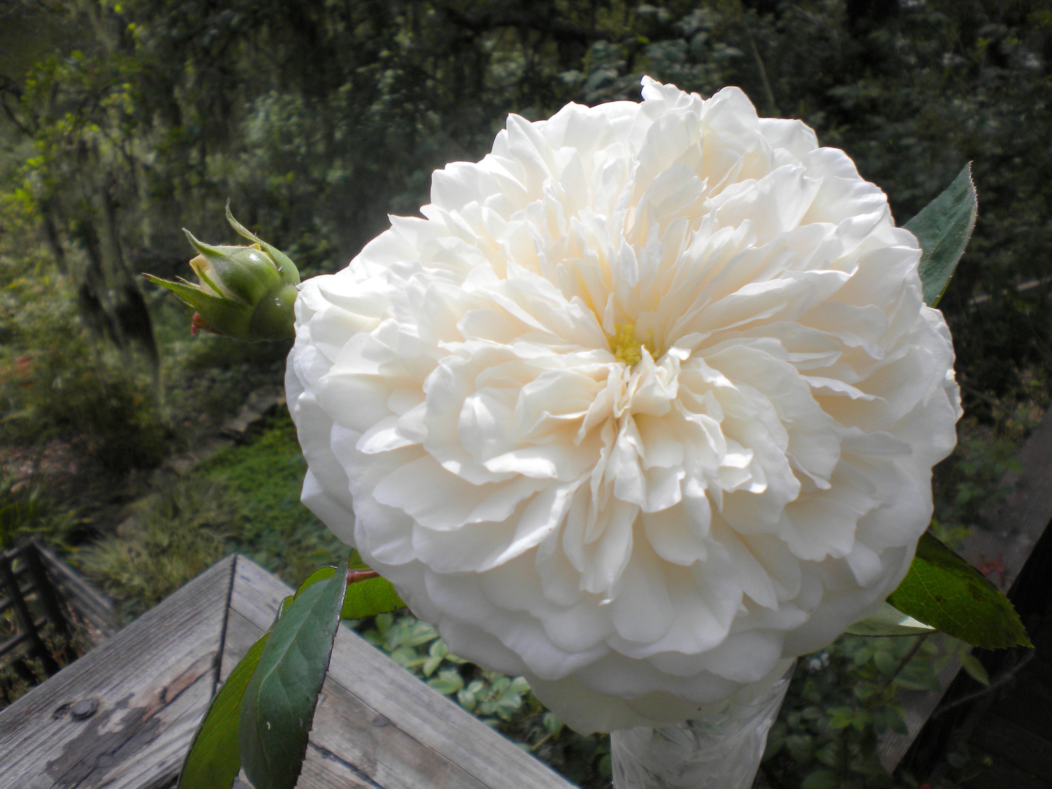 And when I weeded the lower wall this morning I noticed a lone splash of white among the grape vines and it was the first Sombreuil! Just look at this creamy climber. It is spectacular. Some rosarians say it is from 1850 and others say – “no, no it has a mysterious past, we don’t really know where it began.”