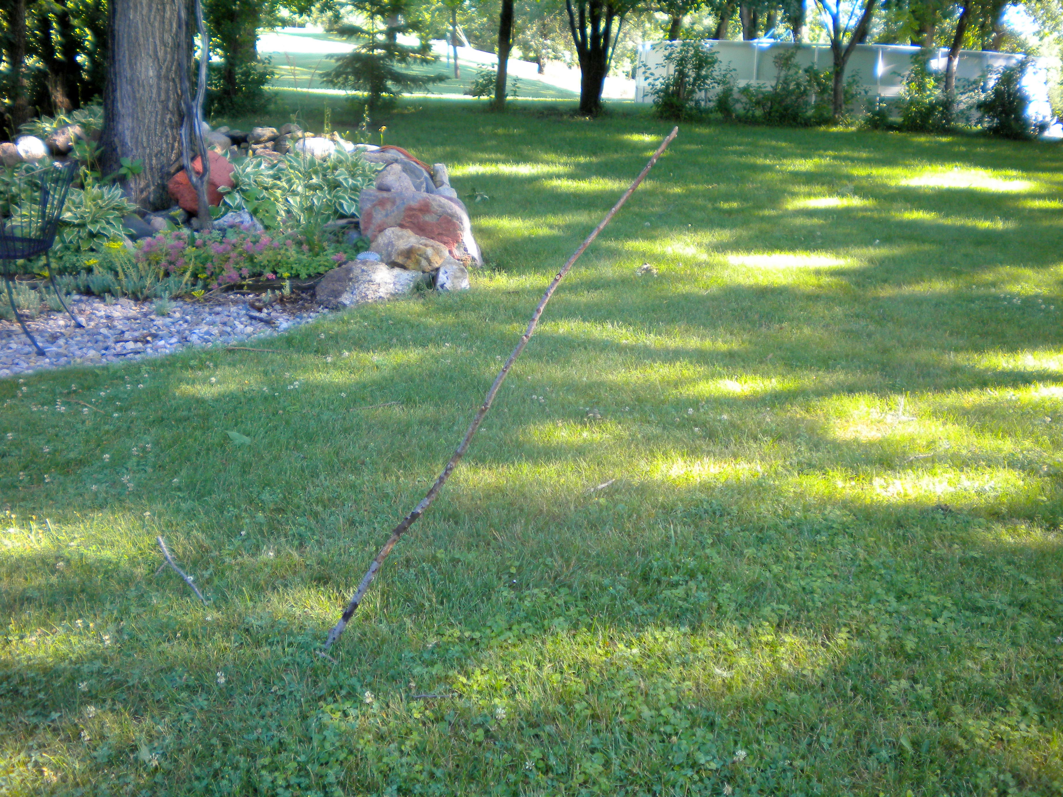In the morning we were none the worse for wear except that one of my heavy metal shephard’s crooks holding the bird feeders had blown asunder and while no major branches were down, the most unusual sight was to see a long spare branch driven deep into the lawn, as if Odin himself had looked down from his dark and buttermilk sky and hurled a spear to earth.