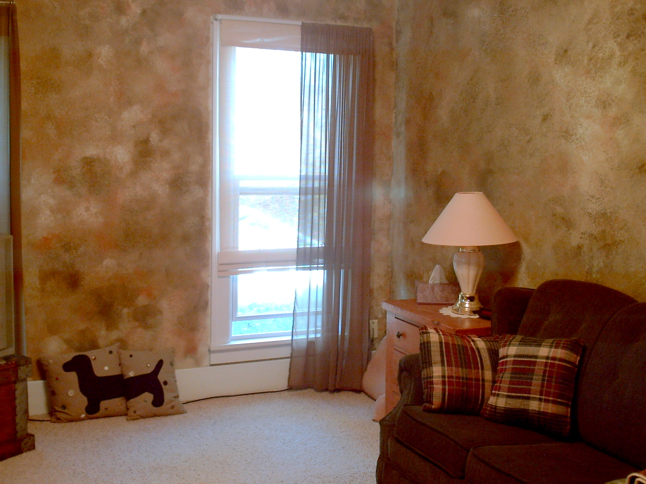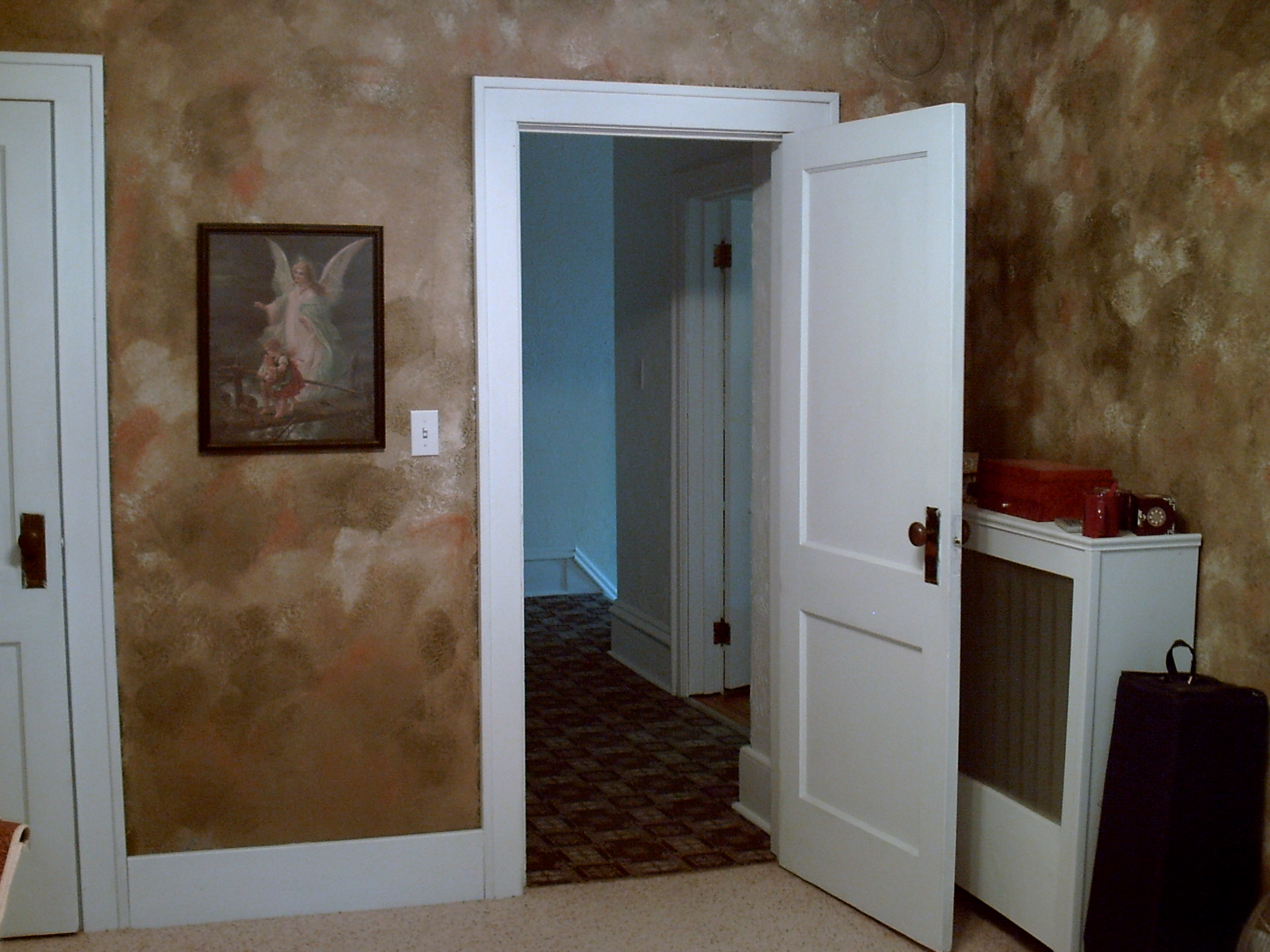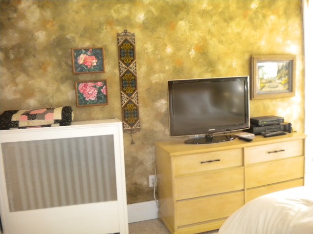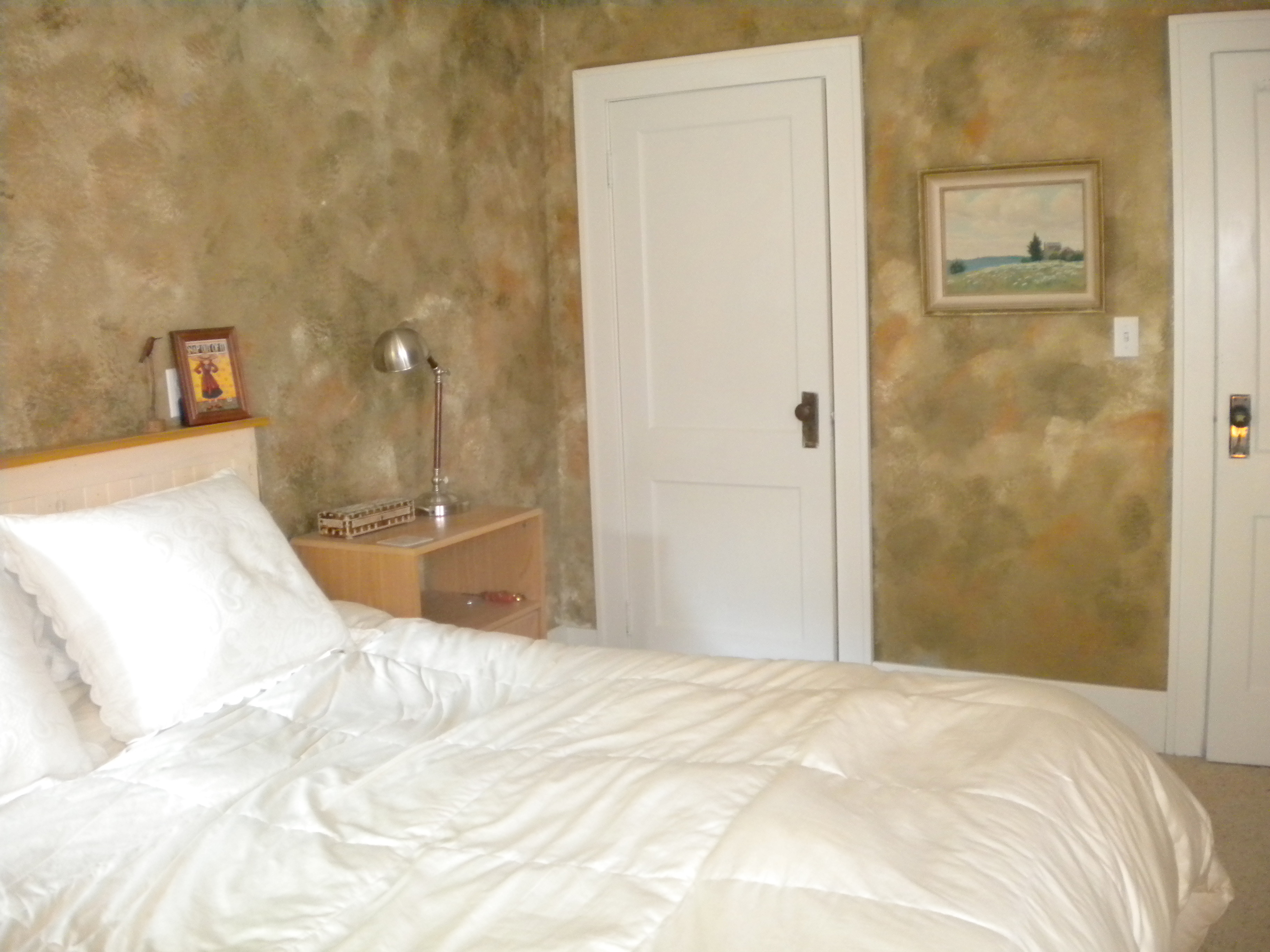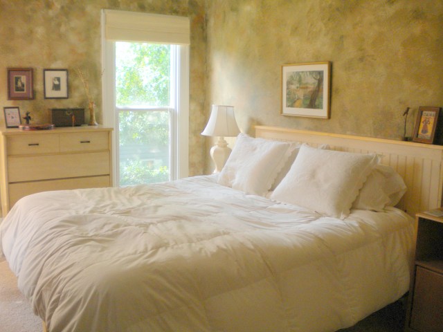 We kept the bedroom walls just as they were. The former owner had put a lot of time into a sponge-painting job which, while not the colors I would have chosen, was done with great artistic ability.