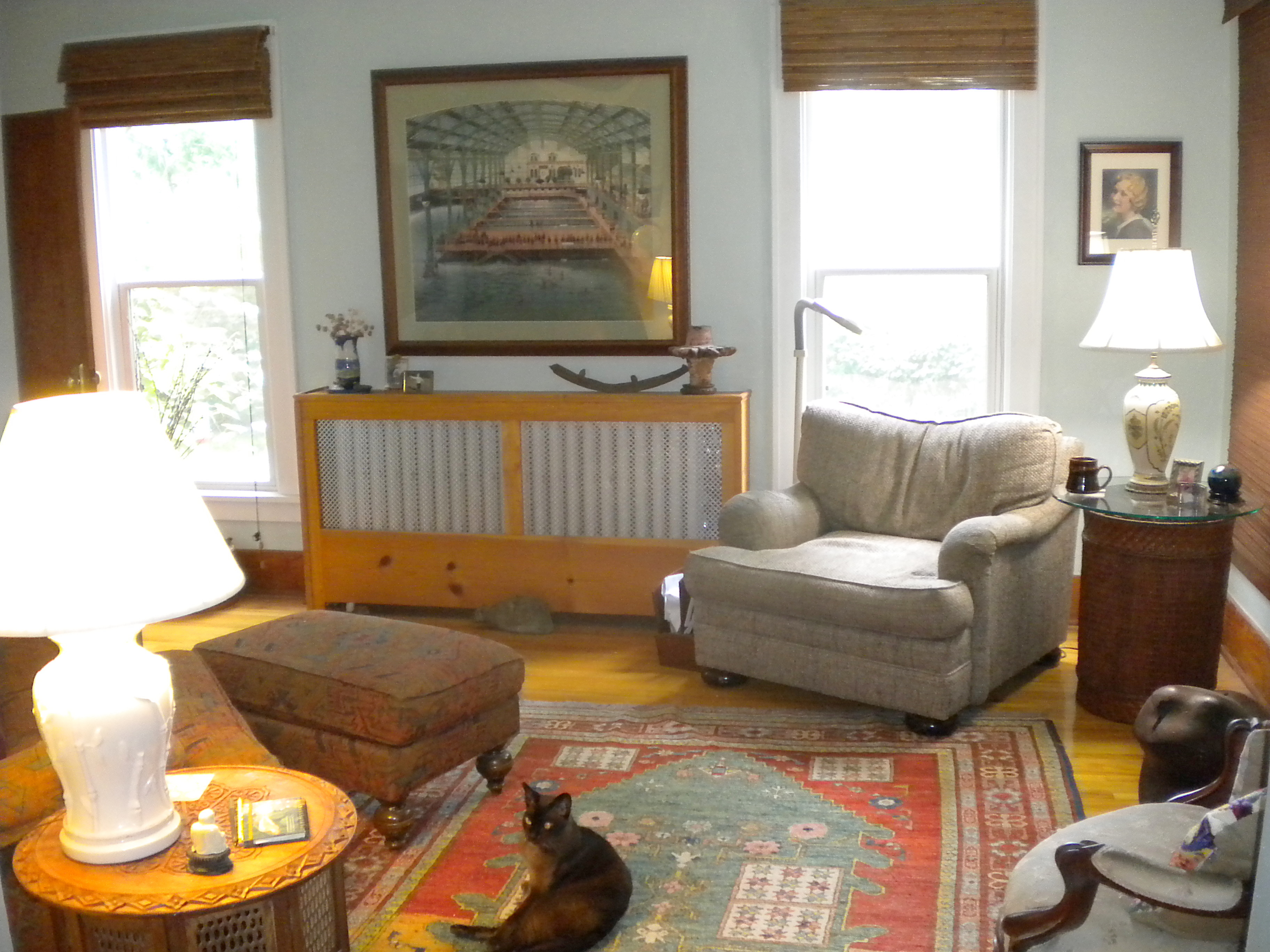 As I remember it, there had previously been a large loom and exercise equipment there and as in every room challenge in this old house – lots of doors, windows, radiators and not much space.