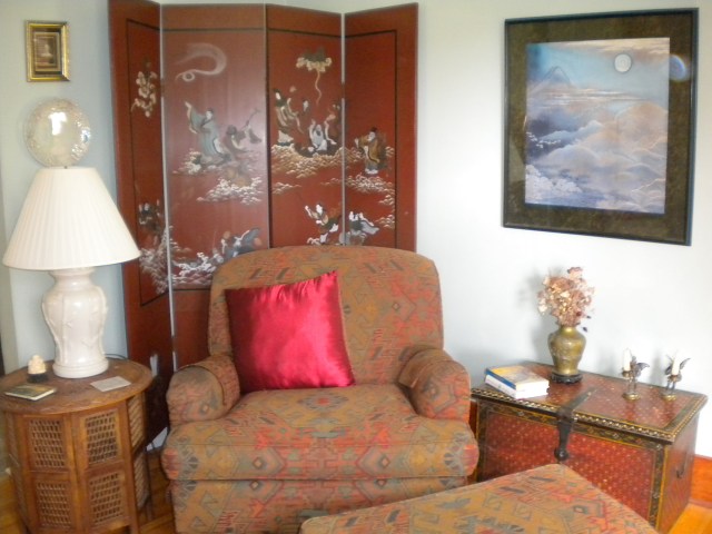 My chair with Chinese screen. The print of Mt. Fuji I carried, rolled up, from the Metropolitan Museum on a trip to visit Kevin in New York. On the wall is a picture of Grandma Marie and her wedding plate.