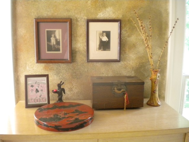 T.M. (aka Bob, Robert) insisted on shipping Harriet’s 1920’s bleached mahogany dressers, which I found dated and somewhat depressing, along with the paltry amount of furniture we did bring with us from California. He said because they were made when quality was popular and they do show the Kroehler, Hand Crafted Furniture labels inside the drawers and still have the original “Genuine Mahogany” cetificate issued by the Mahogany Association of Chicago, 1930. Who knew that they would look so perfect against the darker smudgy walls. Thanks Mom.