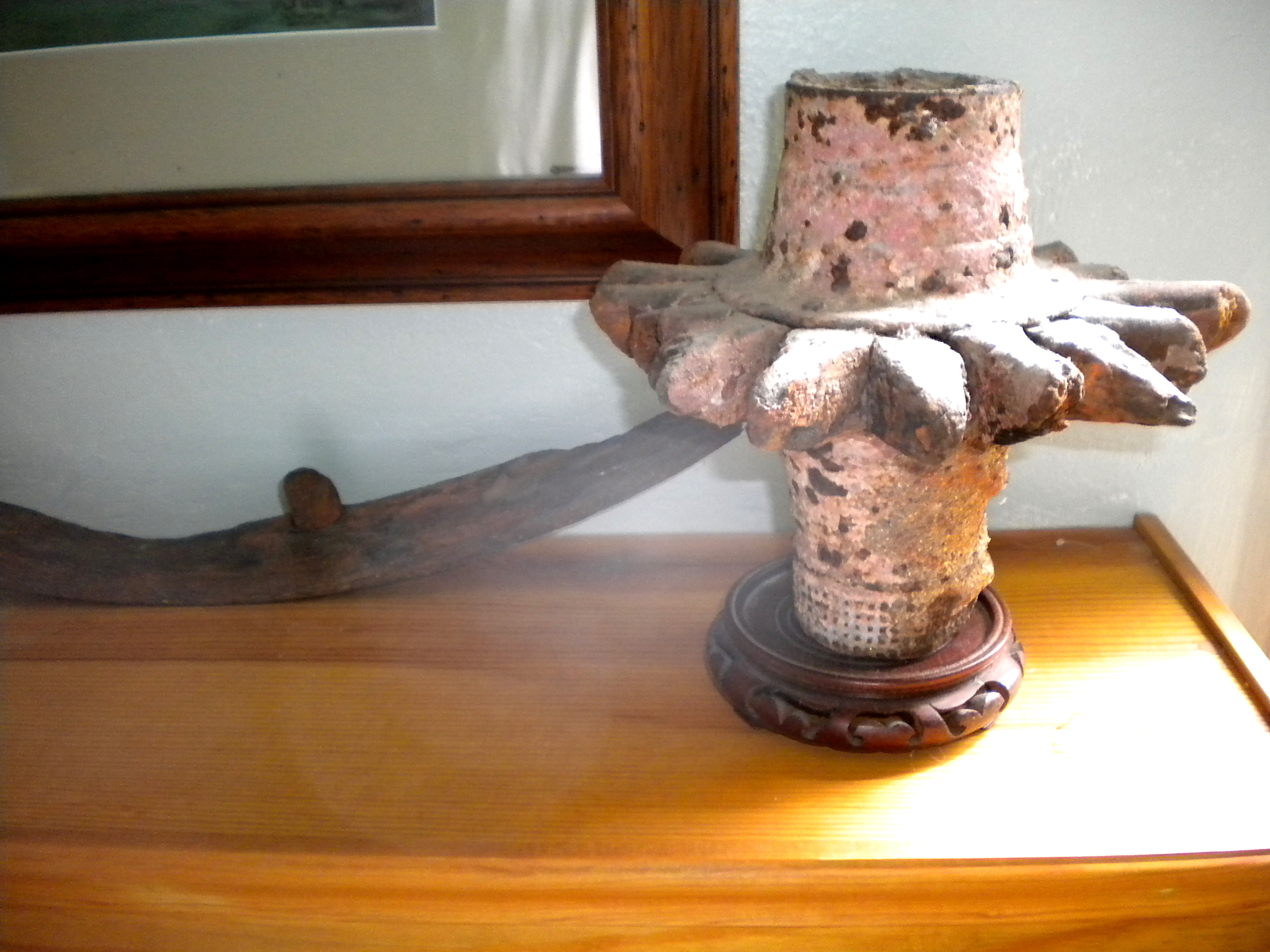 When T.M. was building our house at Bixby Creek in Big Sur, California, he unearthed a wagon wheel while digging a hole for the foundation pole. Bixby Canyon had been a thriving little community in the 1890’s with a post office, school, inn, restaurant with it’s own “locks” to catch fresh trout, and of course a stage stop until a disastrous flood inundated all of the above. We left the spokes as part of the foundation and salvaged the hub and a part of the frame. One of our special treasures. It’s starting to look like home!
