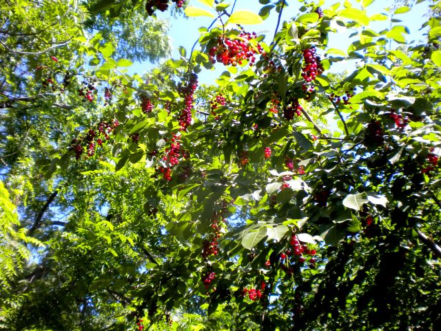 And there’s more. Another large shrub – again among the lilacs – also has red berries, but redder and smaller like a current and sprinkled throughout the branches rather than in a cluster. Again – new to me. One would think the birds would be in heaven, but as yet I haven’t seen any having a snack in either locale. But they’re quick.