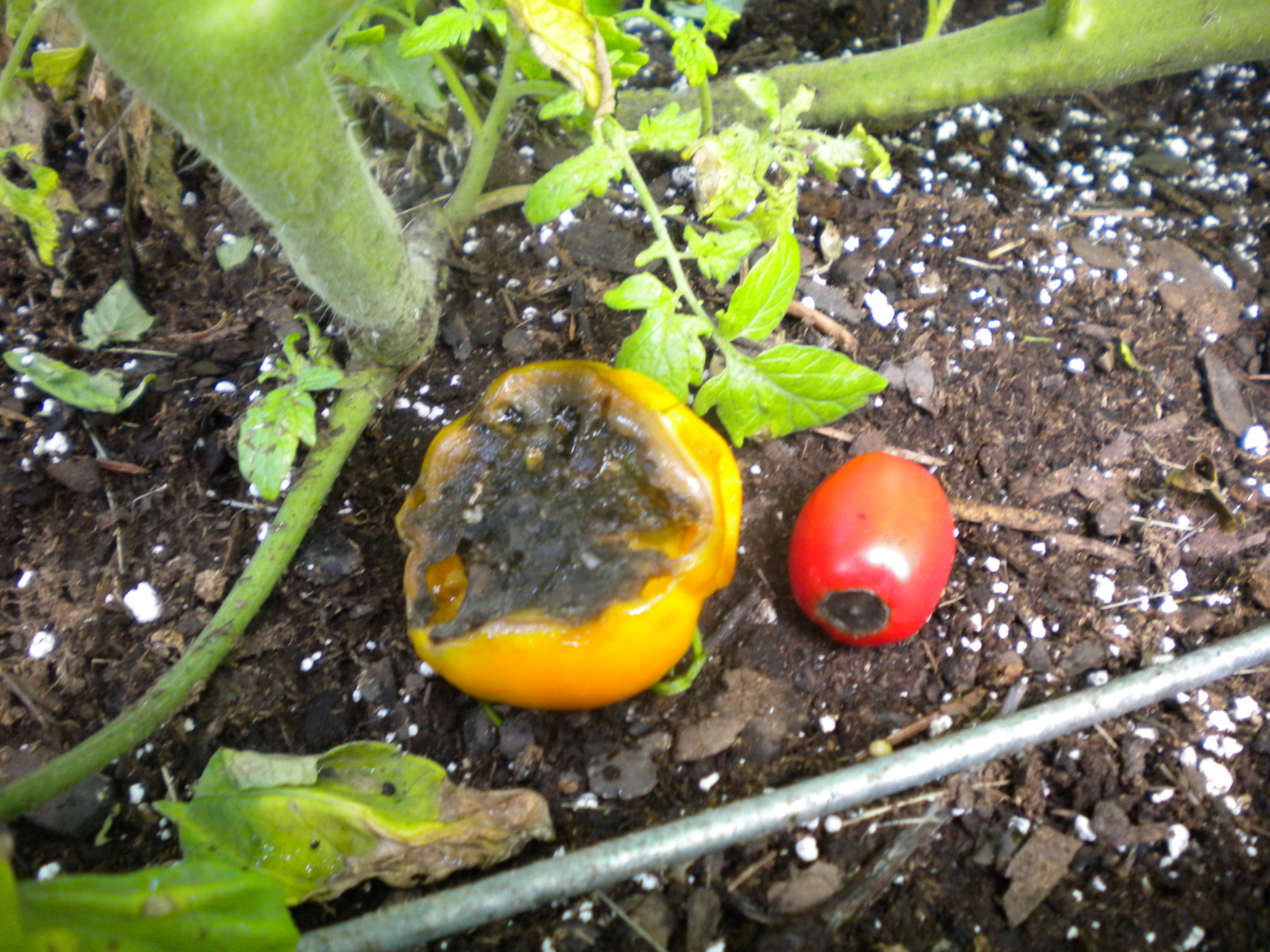 The tomatoes have been a new and frustrating experience, and this after my cockiness from last year’s splendid crop. In other words – they have blossom rot! Not a pretty sight.