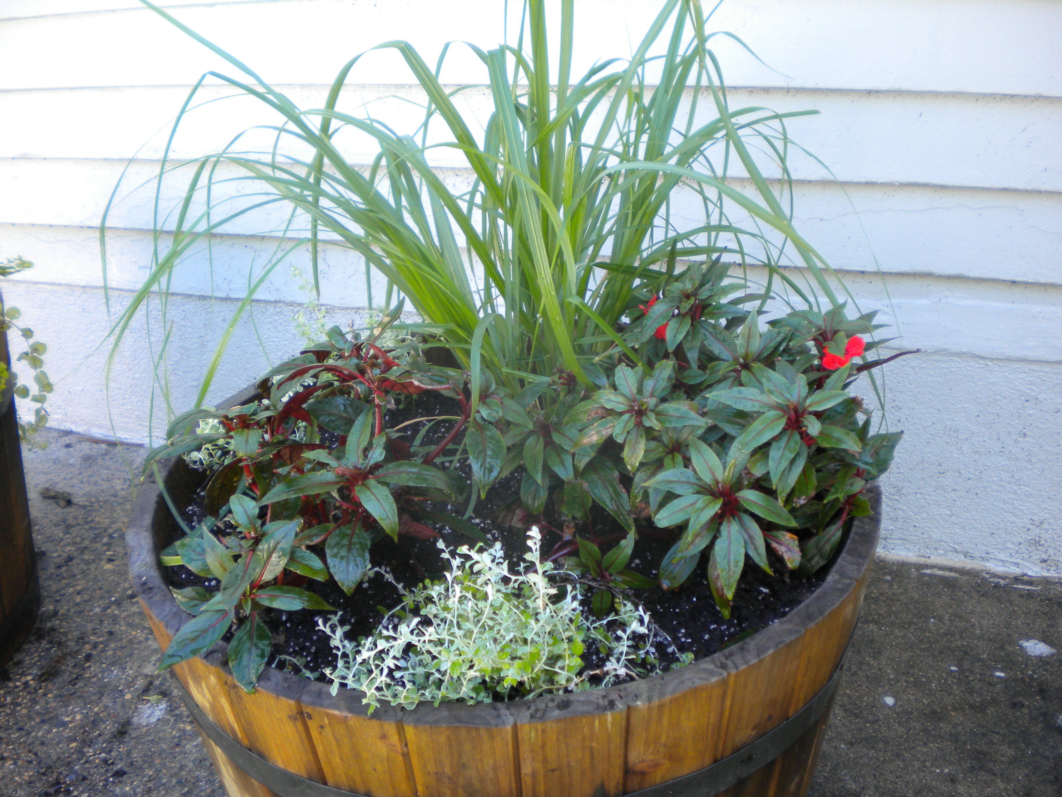 For one of the barrels I used fountain grass and double impatiens with licorice plants –