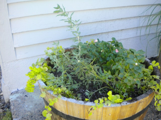 My first choice in fact was something labeled “Swedish Ivy” and the tag said “weather tough, chosen to stand up to the toughest weather conditions”. But my Sunset Western Garden Book lists it as an inside or tropical tender vine and so I’m confused, as well as by the other two (also labeled “weather tough”) – Sweet potato vine and Jewels of Opar?