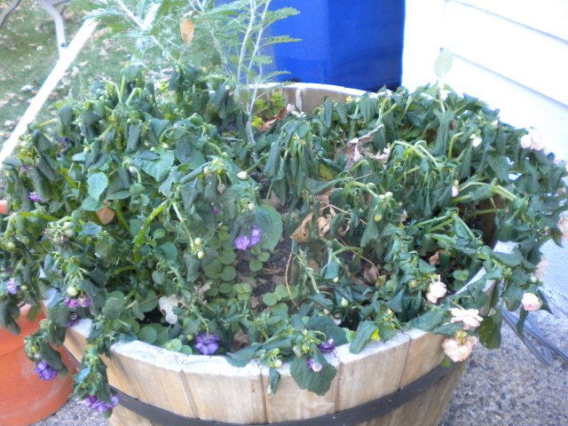 When I went to fill the bird feeders mid morning, I found that the birdbath had accumulated a thick layer of ice in the night, not a thin crusty sheet, but an actual inch that required some serious chopping.  And as I walked back past the tubs by the back door, I had a shock to notice that the very impatiens which just yesterday had been in full and glorious flower, were recipients of the first real freeze.  So too, the valiant tomatoes which were picked just yesterday.