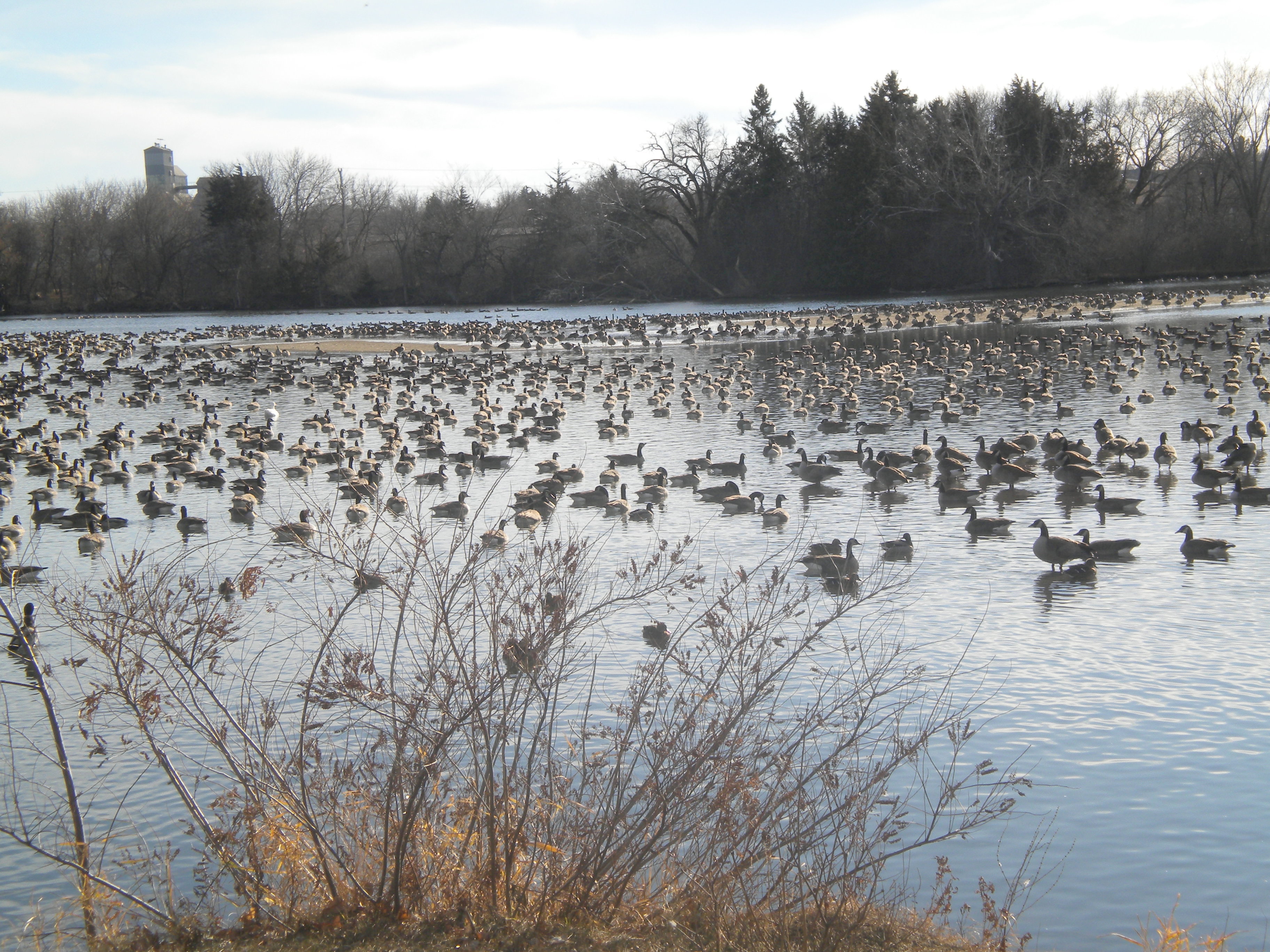 Here at a bend in the Otter Tail River, there is a surprising phenomenon at play. At least it is surprising to me, new to this clime and environment. We expected the Canada Geese to have migrated by now, down to the south along the Mississippi flyway. But they are still here and in greater numbers than in the spring and summer. It’s as if multiple flocks from Canada stopped along the way for a respite on their migratory journey, and fell in love with our estuaries. It’s difficult to describe the vastness of the scene. The river along the bends are wall to wall geese. The banks and the grass ways are inundated. And at some point each day, usually in late afternoon, they take to the skies. Not in the usual Vee formation, meant for serious travel, but swooping and honking in massive groups as if taking their daily constitutional. There are thousands. I need a wide angle lens and, better yet, Cinerama, to capture the magnitude and magnificence.