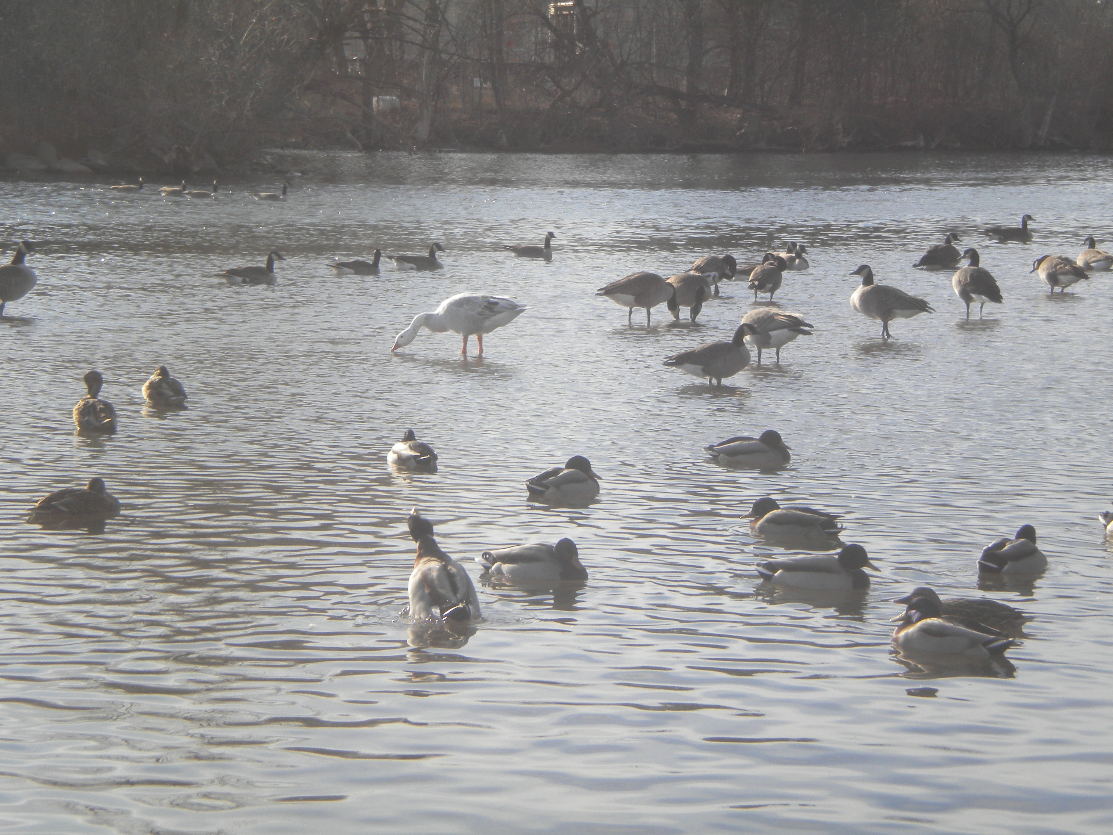 The major surprise, however, is that one lonely and lovely Snow Goose is among the throng. I’ve been scoping her out every day as she waddles across the grass looking for critters along with the flocks. Or floats and fishes in the shallows, a bright white highlight among the brown. What I wouldn’t give to know her story. Did she get lost and separated from her mate on the journey and now waits and grieves? Like the Ugly Duckling, had she been an orphan raised by another species, continually suffering an identity crisis, not really knowing her own worth and beauty? But stuck nevertheless, betwixt and between? Or has she appeared just to enchant me?