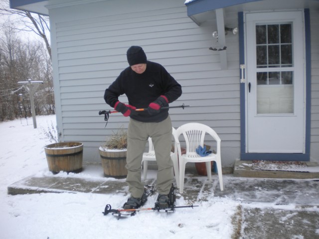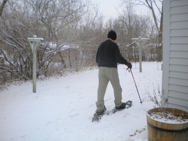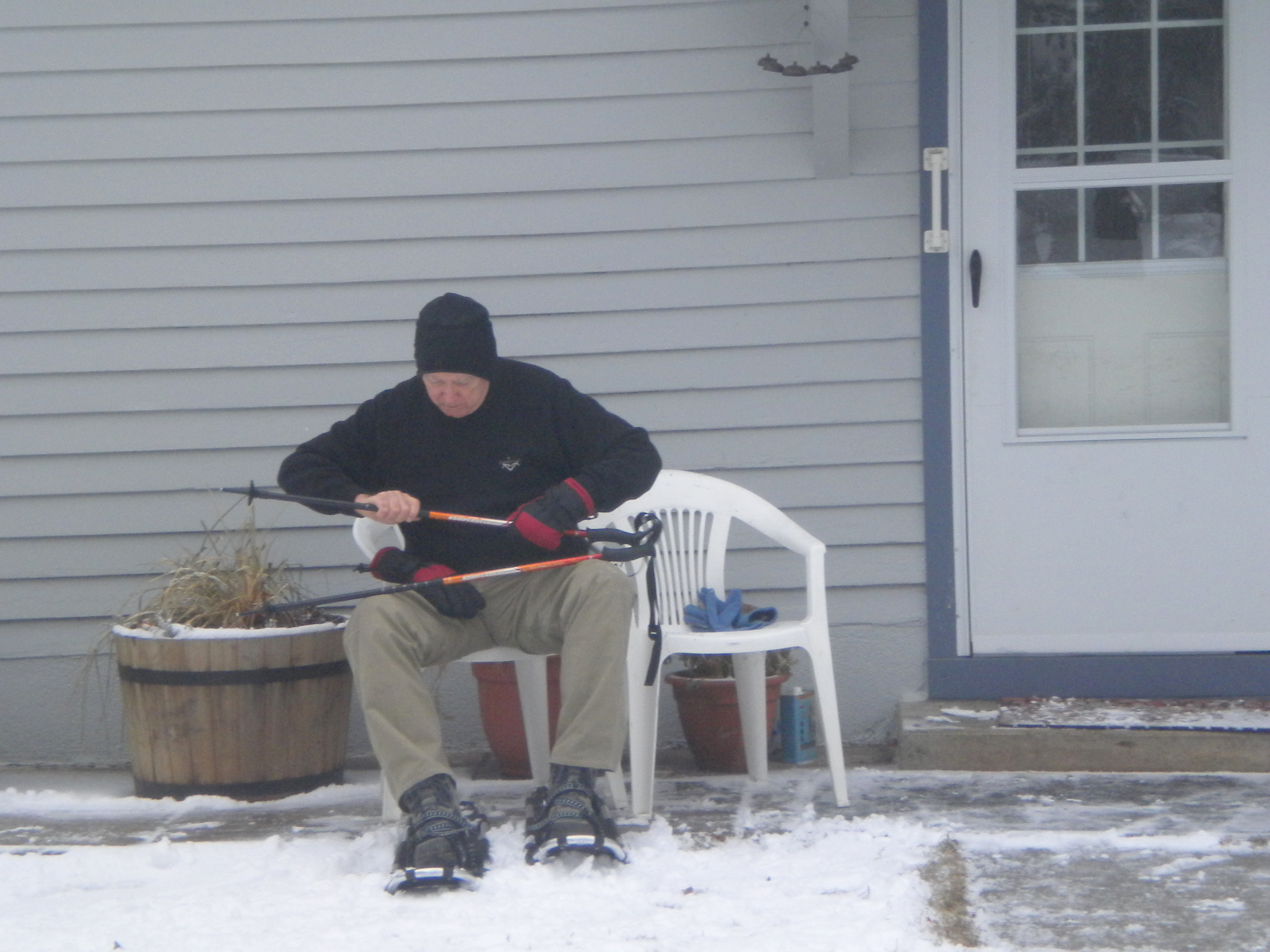 Dad, generally you do need to wait for snow to get deeper than 2 inches before donning your snowshoes. Although I’m sure practise does make perfect.