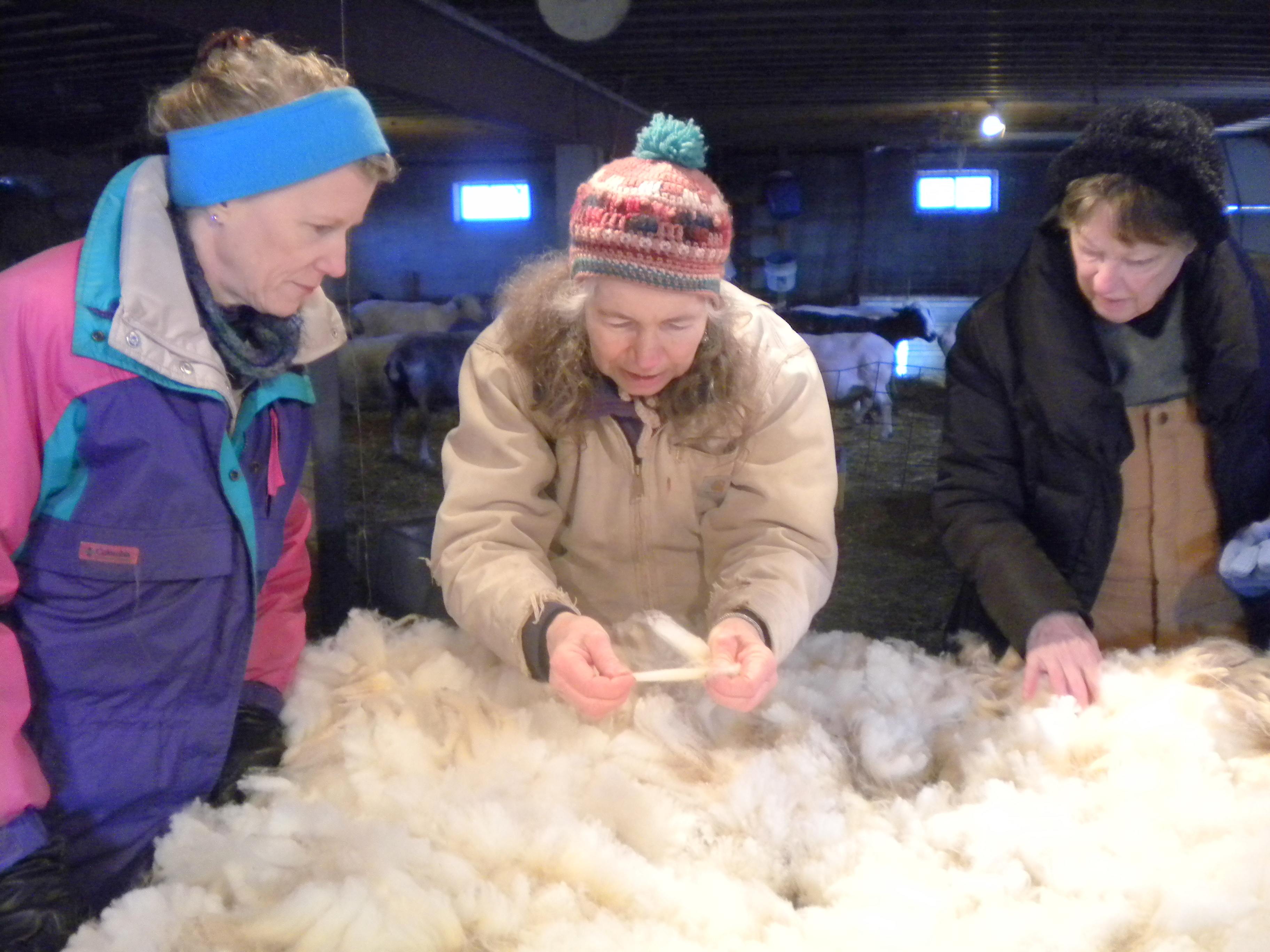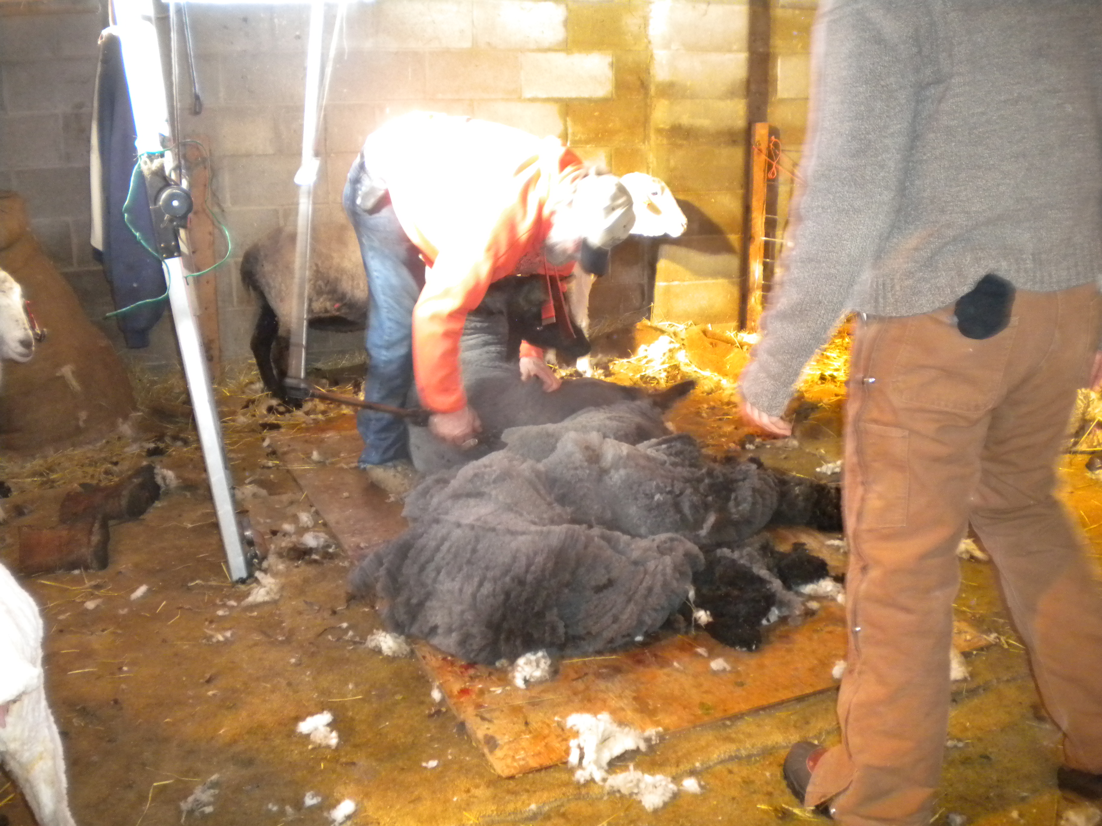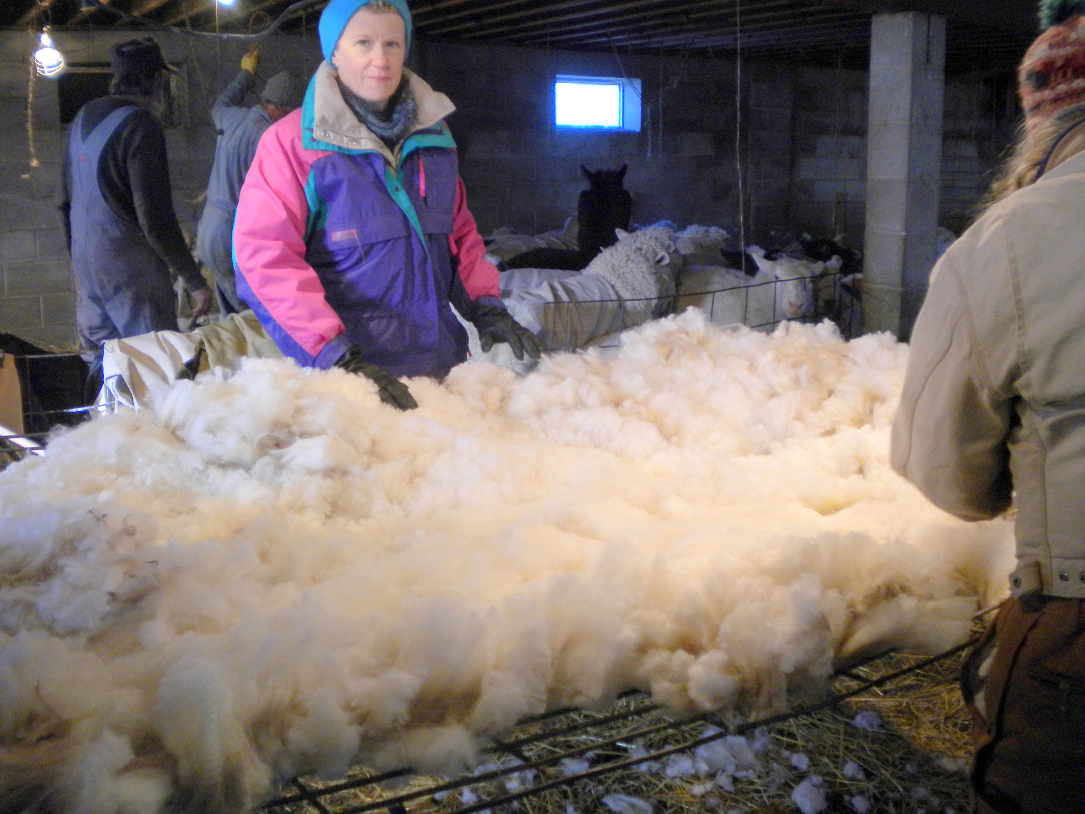 Each shear goes onto the metal skirting table and I stand about with other helpers, picking, picking, learning what to discard, what to celebrate. We pick off the little “second” clumps, the yellow urine stains, the pieces of straw, alfalfa and poop.  I’m introduced to “luster” and “crimp”.