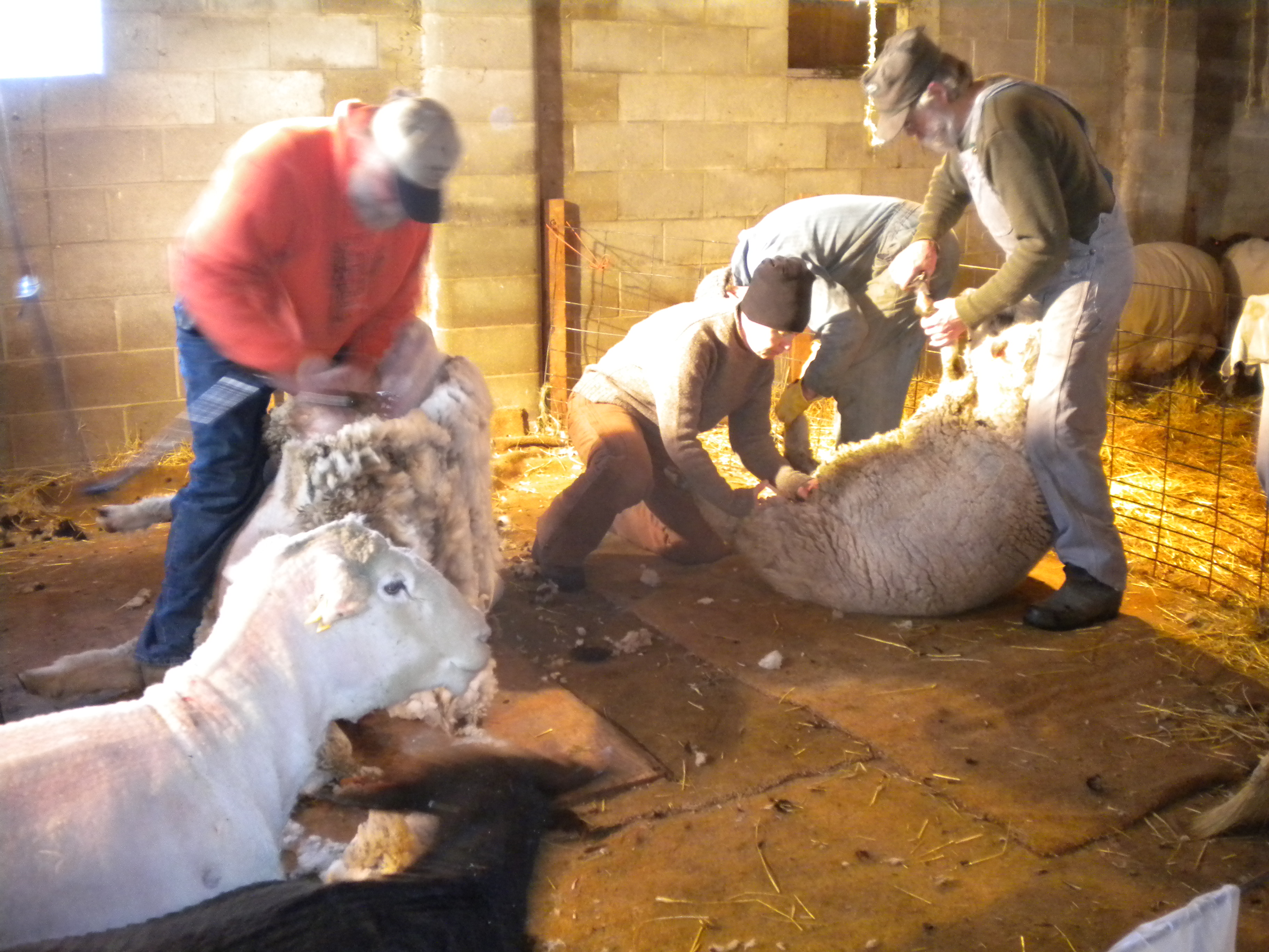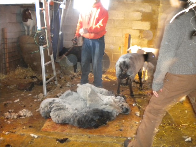Now and then one has a day, start to finish, which is replete and chock-full of the following descriptions:  excitation, novelty, apprenticeship, endeavor, jollity, friendship, enlightenment, insightfulness, and full-filling-fun.   Not very often, but this was mine.  So it was that I spent a recent day by getting up in the dark and hastily dressing in the warmest garb which I had chosen the night before  and driving to meet Meg and Betsy at their parent’s house and then proceeding on to Pelican Rapids and the annual sheep shearing at the home of Joanie and Dave Ellison.