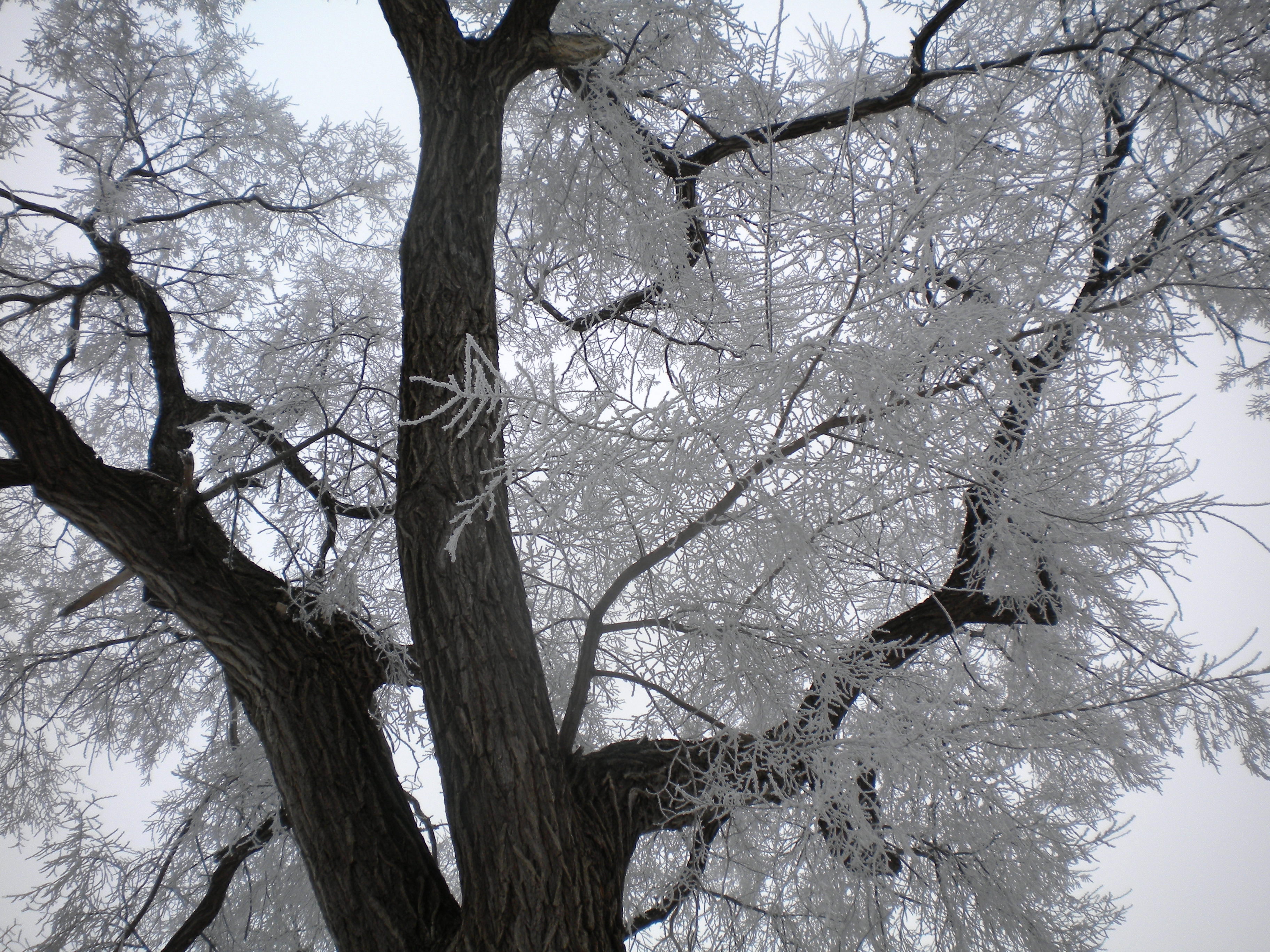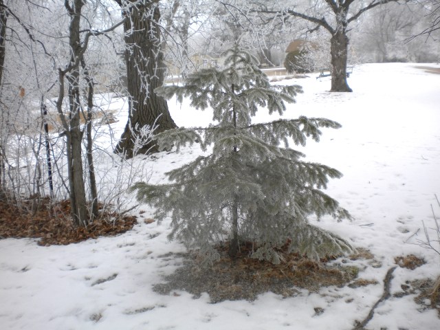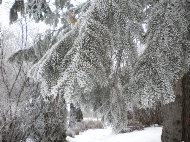 It turns out that we are experiencing RIME which derives from the Old Norse word “hrim”, which means frost. And rime is caused when water droplets in fog (which has been ever present the past few days) drift through the air and freeze on objects above the ground. As opposed to hoar frost which occurs when heat losses rise into the air, bump into higher objects and cause ice crystals to form. “Hoar” is the Old English word for “elderly white hair.” Actually the rime looks like white hair on some of the droopier trees.