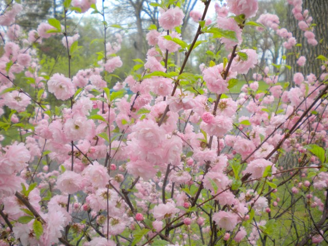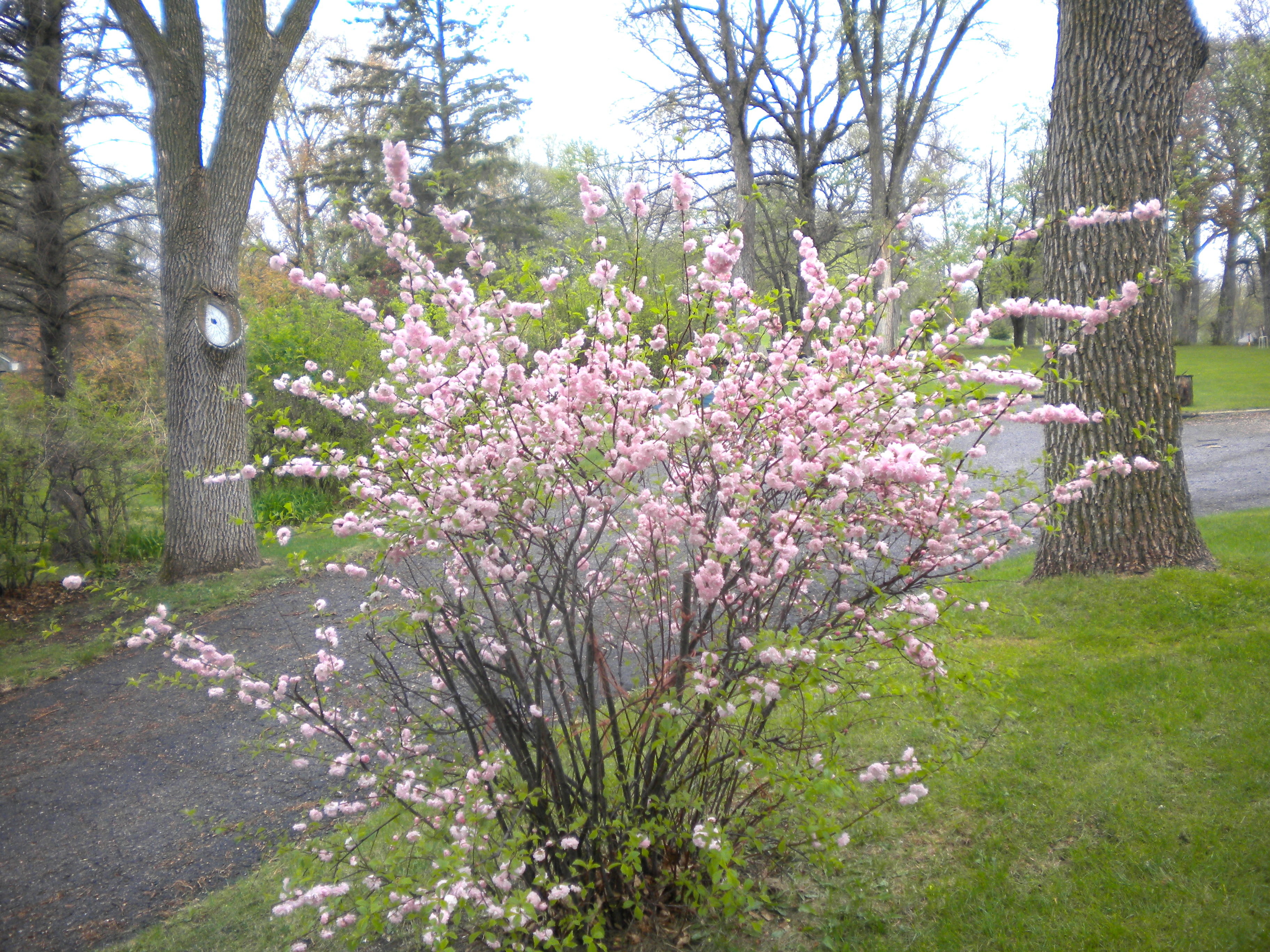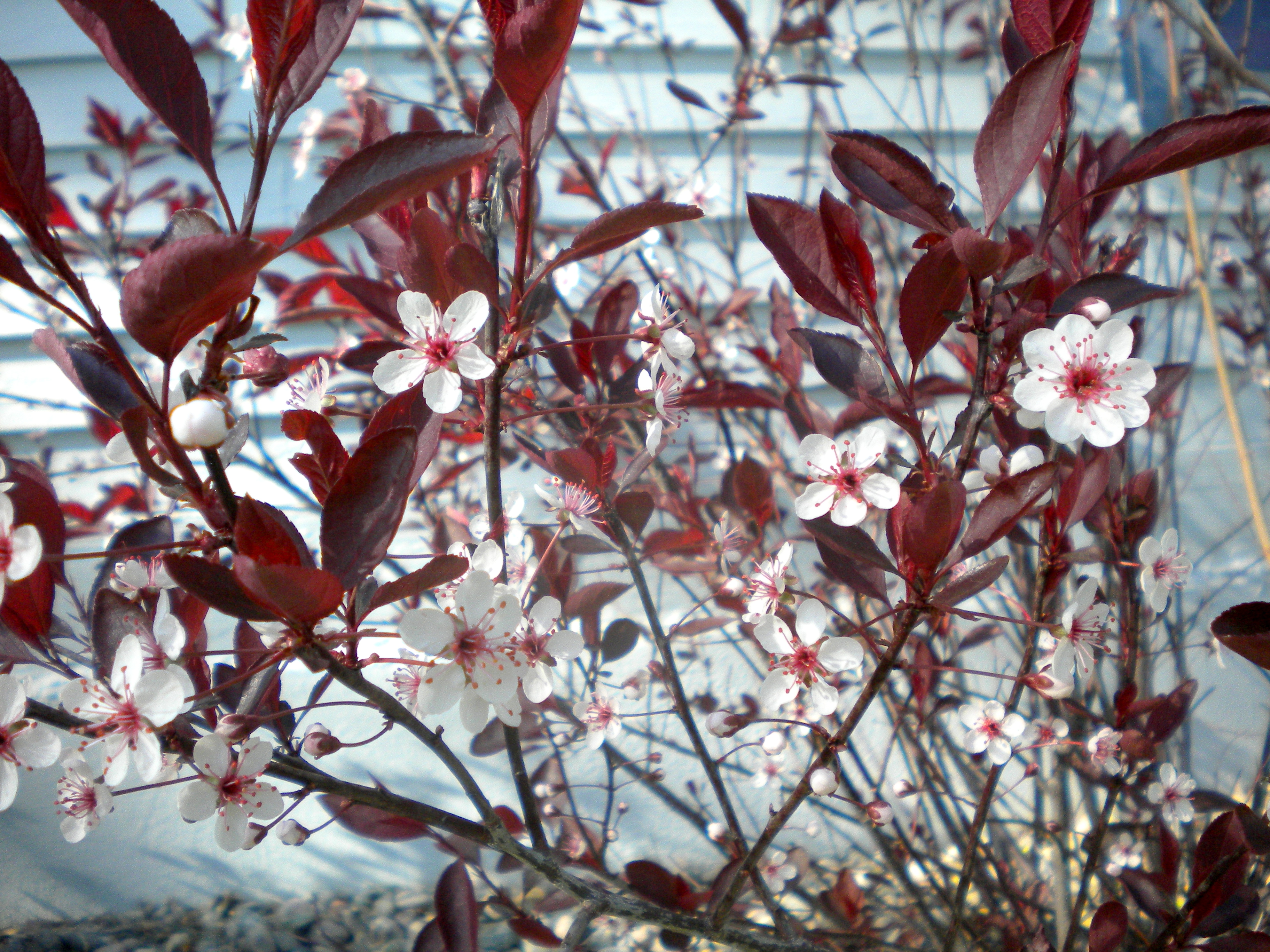 The second to bloom on Mt. Faith is the Purple Leaf Sand Cherry – prunus x cistena – with it’s sweet teensy white flowers and dark foliage. Thank you Marlene, for properly identifying this shrub last season.