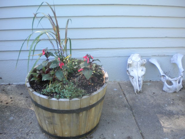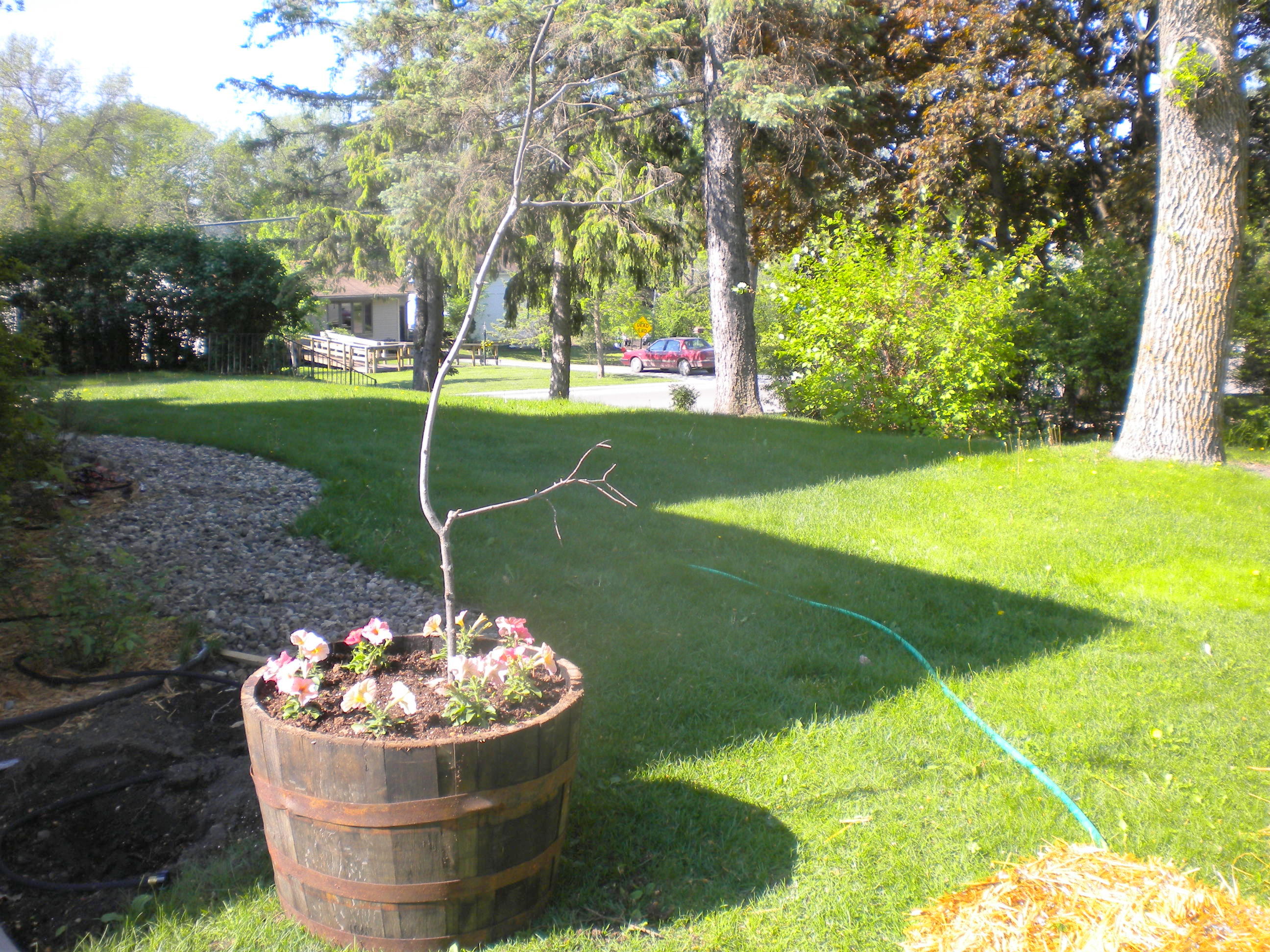 Tub 3: At garden club I won a drawing for a dahlia “Sorbet Blend”, which should come up on my “tree branch stake,” surrounded by petunias.