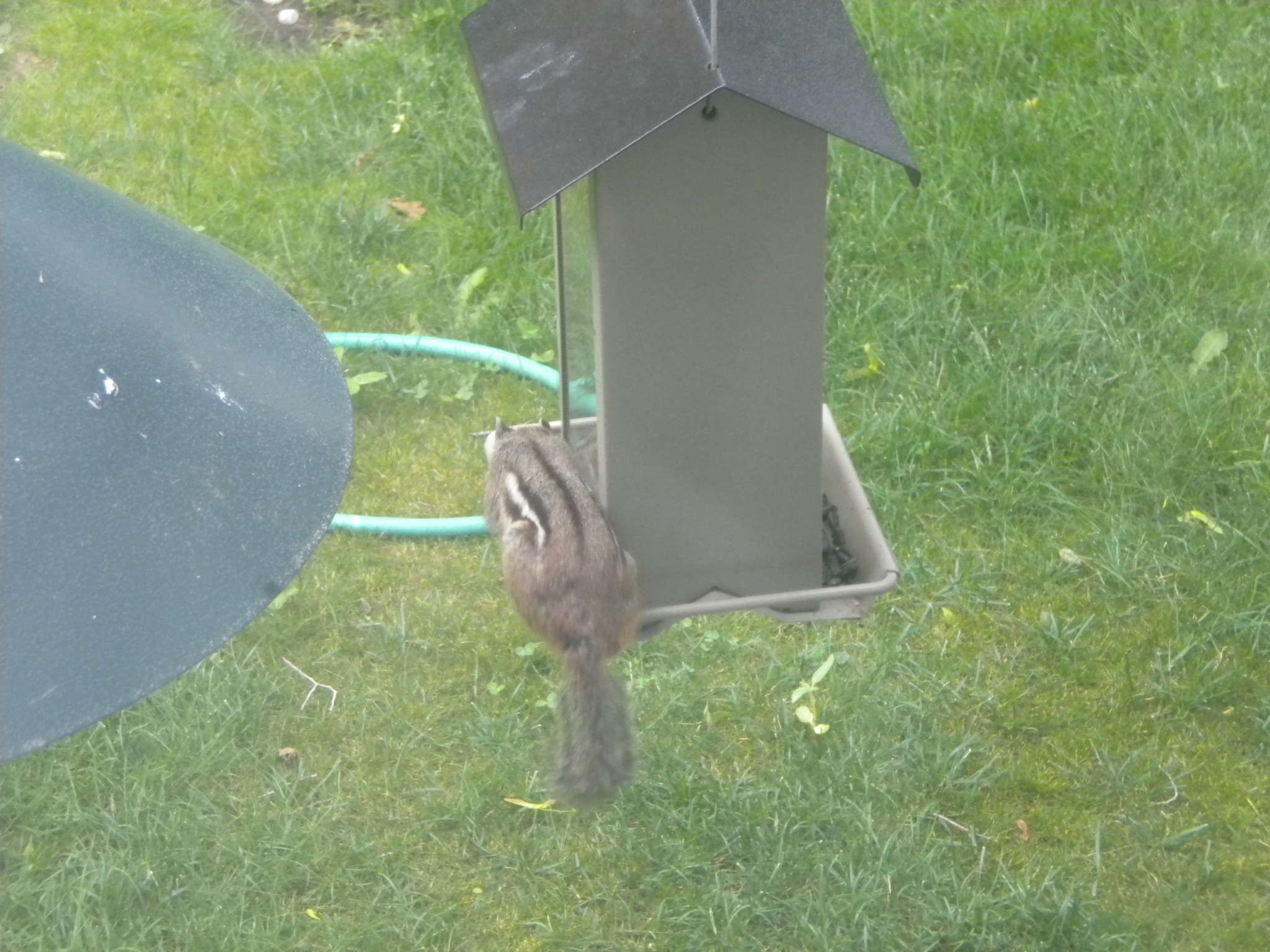 If I still ooh and aah over the bunnies, I have not continued in the same fascination mode with the chipmunk. Those little devils are eating us out of house and sunflower seed! I’m filling the feeder every day, just for him. The baffles on the Shepard hooks have deterred the squirrels. But not the chips. They can climb anywhere.
