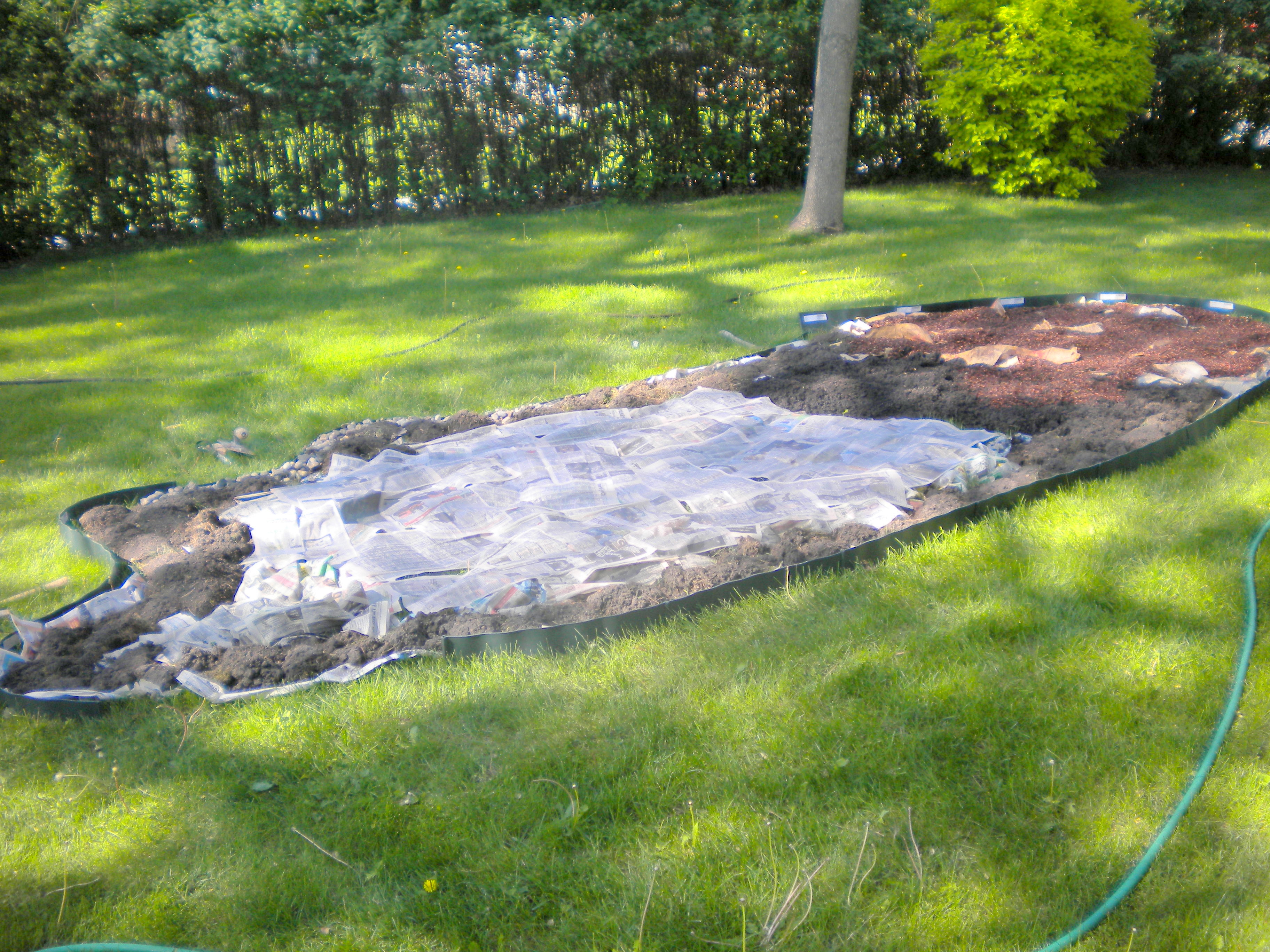 It entails positioning the new bed with a garden hose, curving and snaking the lines until it looks just right. Plopping down newspaper, five to ten sheets thick, watering, covering with topsoil and compost – 4 to 6 inches preferably, and covering it all with mulch – 3 to 4 inches.