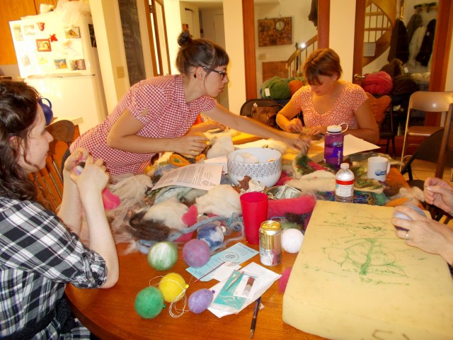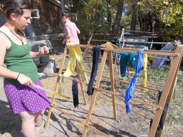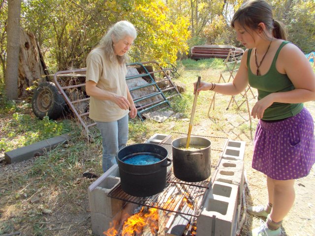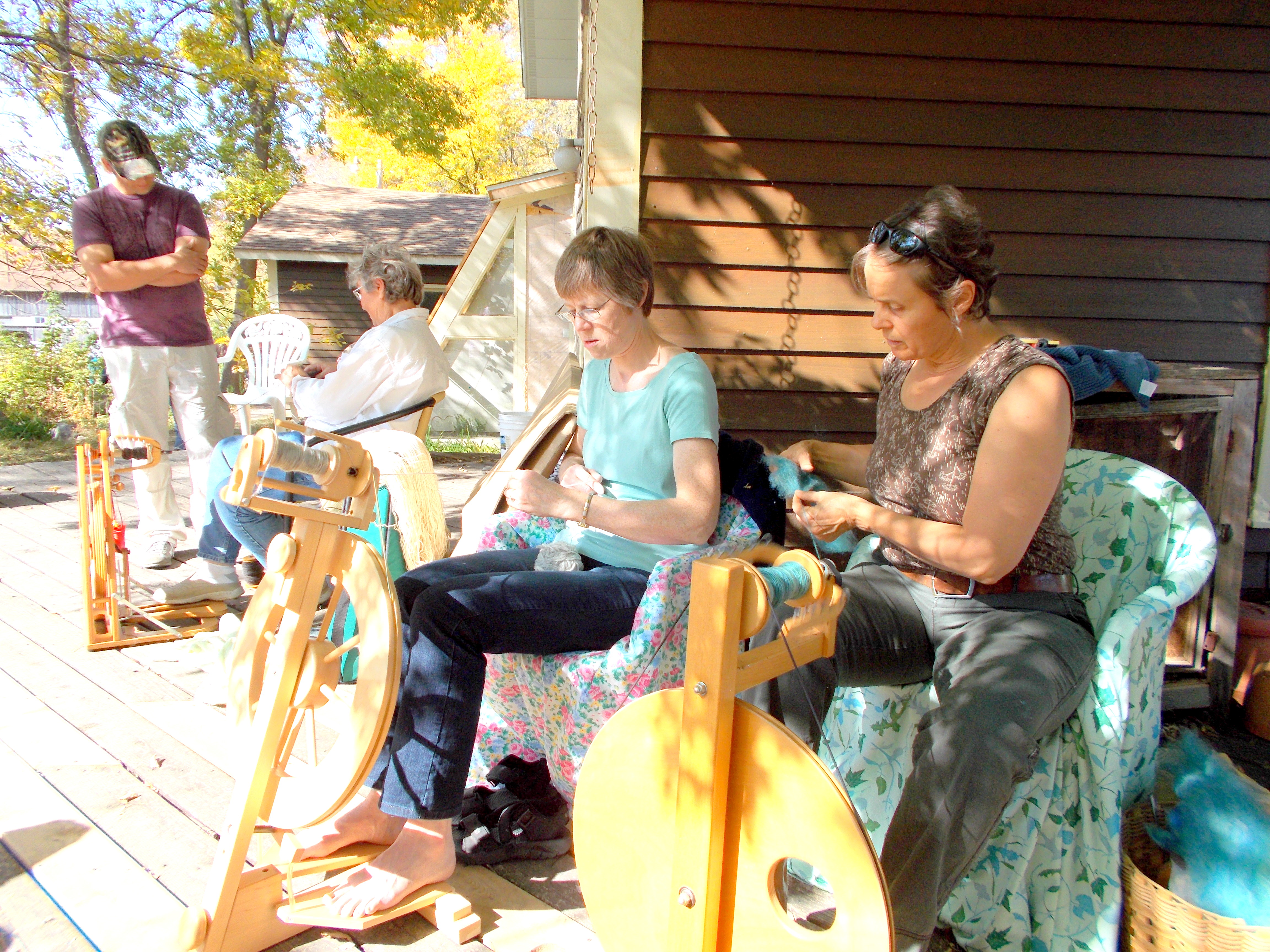 The fiber workers have brought me a new kind of community, one of shared interests, rather than the more common definition of community as people who share the same space. Politics aside, hometown aside, career aside, fiber people gather because they love the soft slide of wool fibers through their fingers as they spin raw wool into yarn, or the surprise when they pull an ordinary skein of yarn from the woad dye pot and it changes color from green to blue. Fiber people gather because of a shared love of fiber, because of shared experiences.