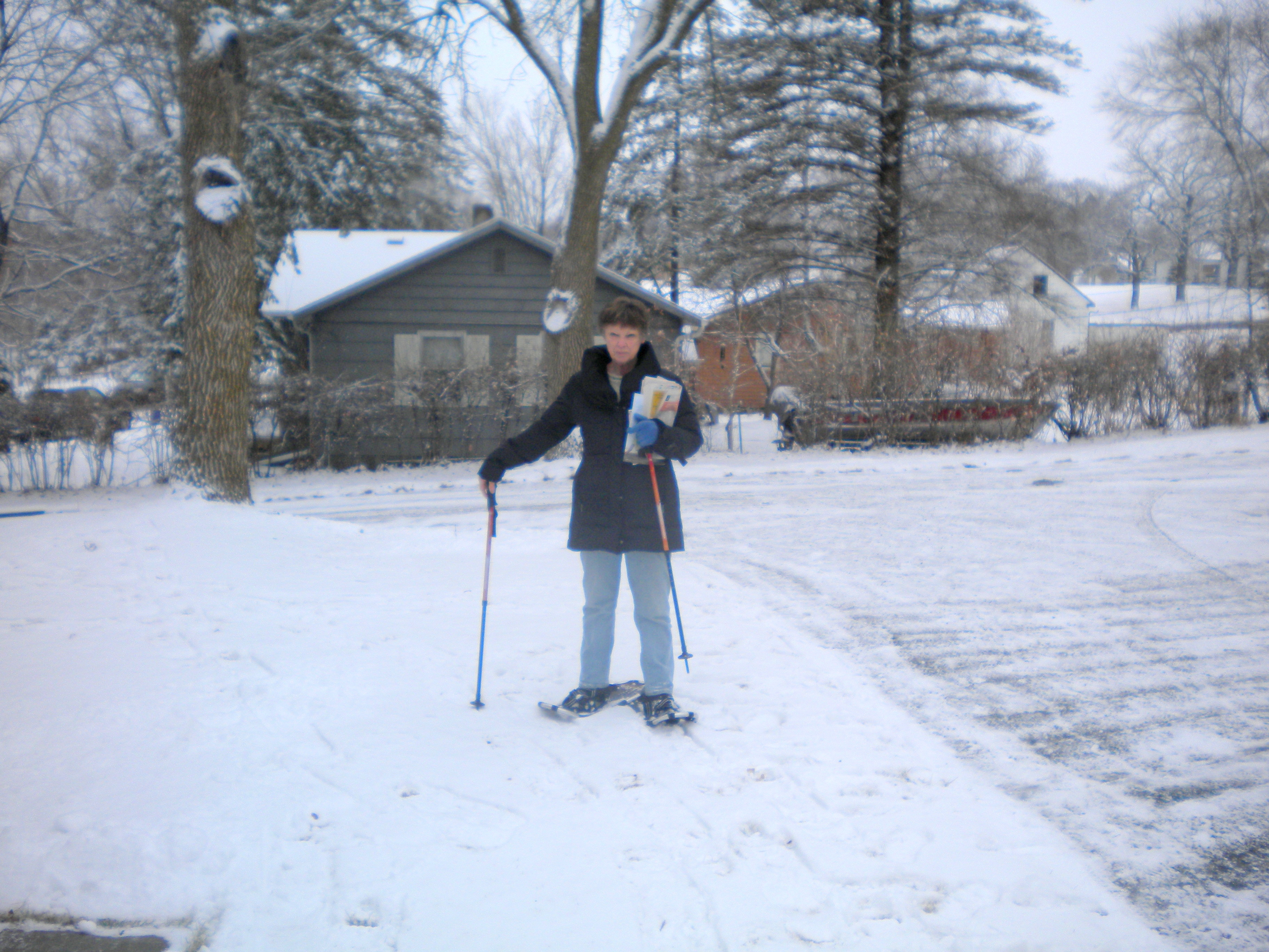 But last winter descended upon us with record cold so that we recoiled while wondering, “what were we thinking?” when we moved from coastal California to the pits of hoar frost. That season I began to worry whenever I slogged down the driveway in order to dig into the snow bank for the buried Star Tribune, that my contact lenses might instantly freeze onto my eyeballs. One day I watched in horror from the dining room window as T.M. took his turn and as he gradually descended, suddenly flipped up and sideways and disappeared. Watch out for the “black ice,” they warn. You betcha.