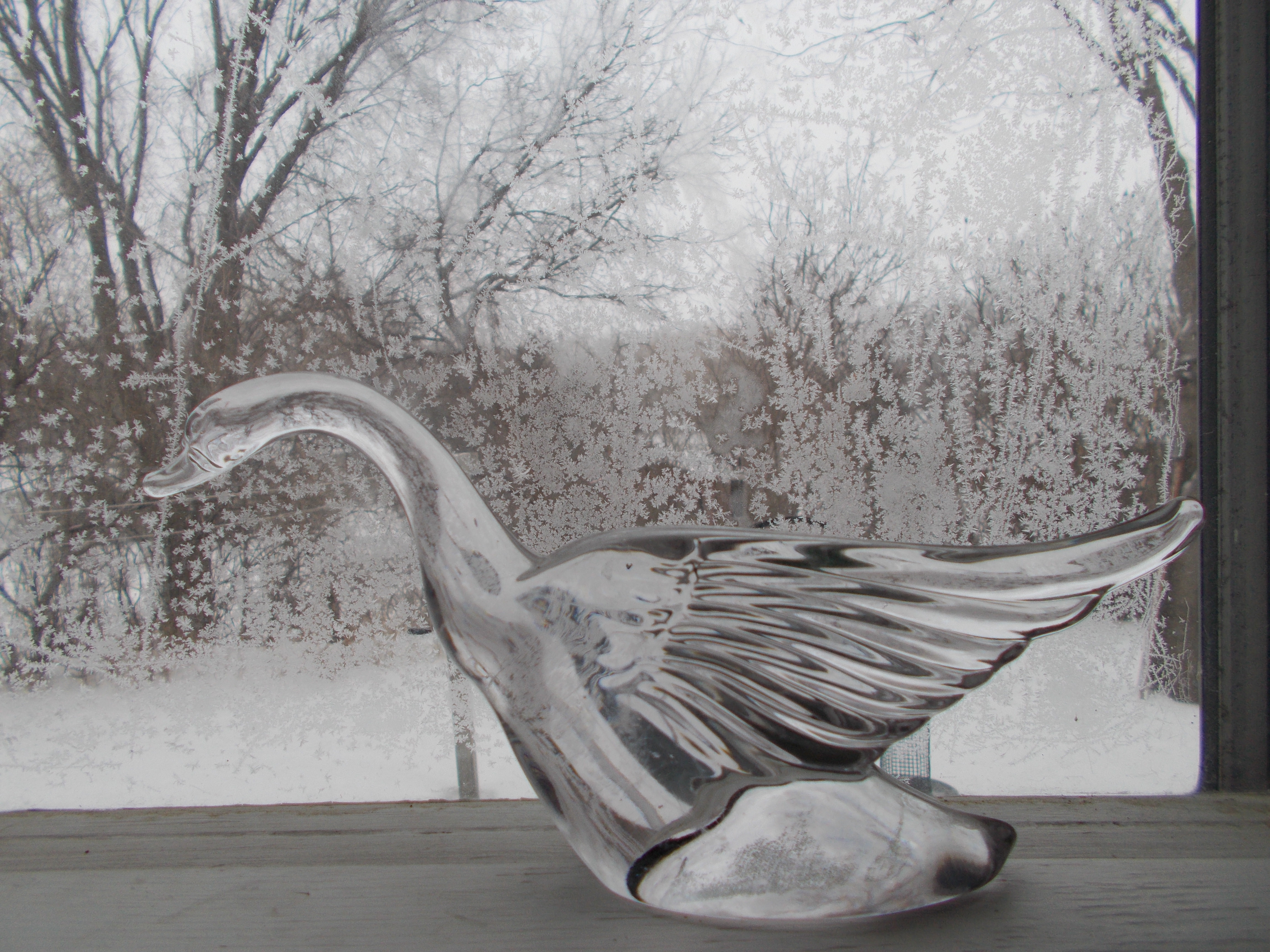 In the meantime, the birdbath in the front yard is buried and the outside of the kitchen door is packed with snowdrift. The squalling flakes are fierce and persistent. Our driveway is snow-deep and impassible.